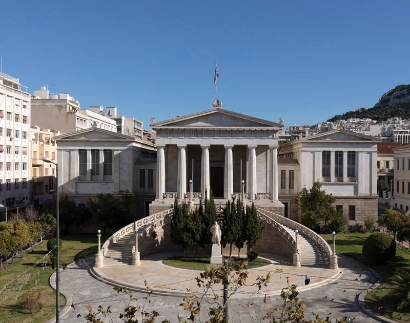 Three magnificent buildings: the Academy, University, and National Library, showcasing neoclassical design.